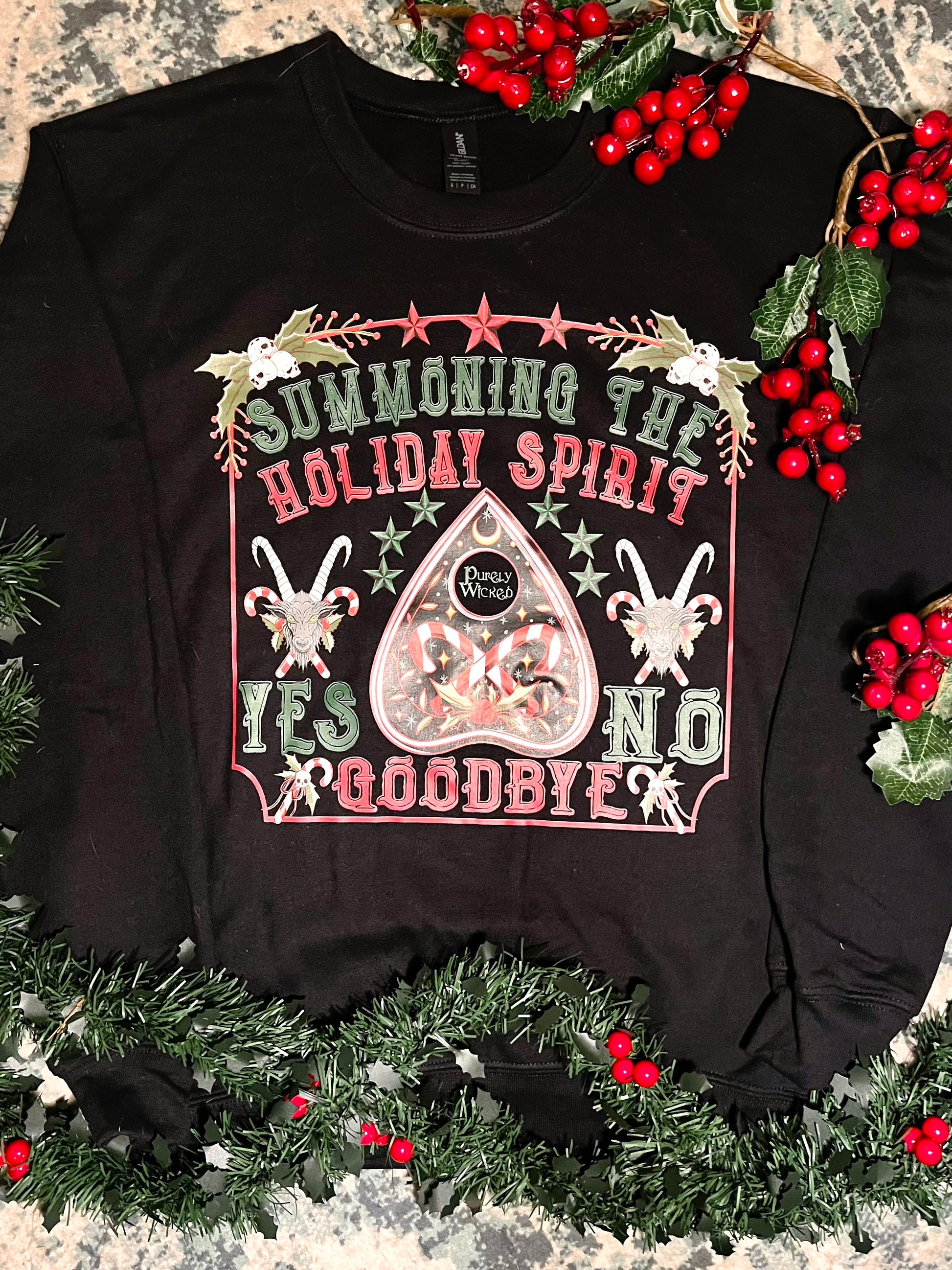 Embrace your witchy side this season with our "Summoning the Holiday Spirit" crewneck! This playful design merges festive cheer with mystical charm, showcasing an Ouija planchette adorned with "yes" and "no" alongside the bold phrase. Ideal for those who celebrate the darker, more enchanting side of the holidays, this cozy sweatshirt adds a spirited edge to your seasonal style. Crafted in black, for a dark versatile look that complements any outfit.