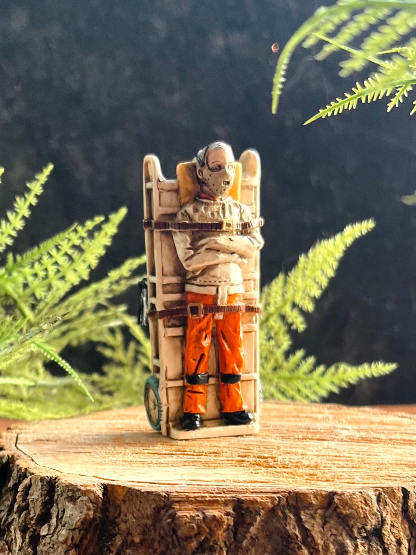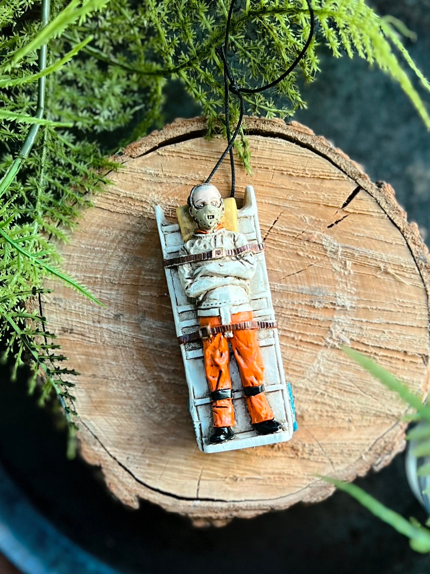 This scary horror ornament shows a crazed man in a straitjacket and a mask, wearing prison orange.