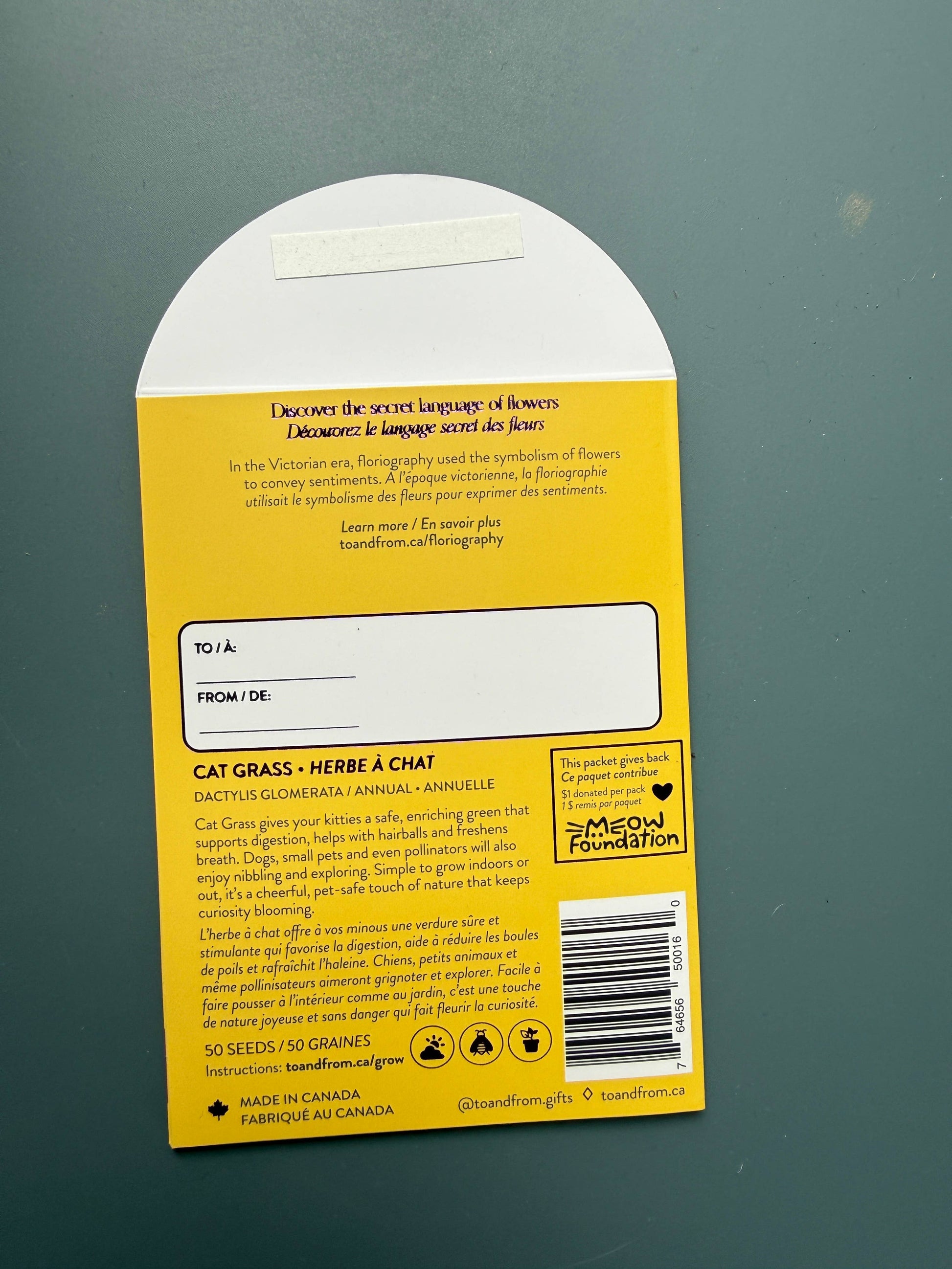 Hand-drawn and printed on premium cardstock, each seed packet features a to/from and custom message area on the back along with an explanation of the floriography meaning behind the botanical for the perfect thoughtful, all-in-one gift. Seeds are sourced sustainably from partners in Canada, and all seeds are organic / non-GMO. Featuring bilingual packaging (EN/FR). CAT GRASS // CURIOSITY Dactylis glomerata / ANNUAL • annuelle Cat Grass gives your kitties a safe, enriching green that supports digestion, helps with hairballs and freshens breath. Dogs, small pets and even pollinators will also enjoy nibbling and exploring. Simple to grow indoors or out, it’s a cheerful, pet-safe touch of nature that keeps curiosity blooming. Contains: Approximately 50 seeds