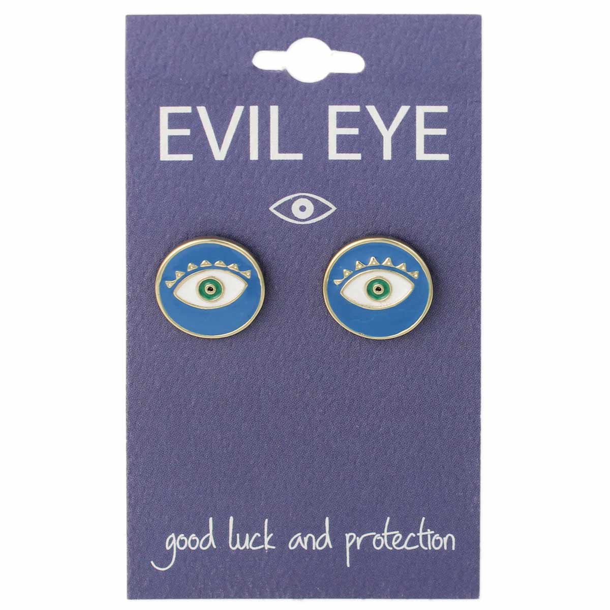 Make a symbolic statement with these gold and blue eye round post earrings. Round gold earring includes a eye symbol with green center in dark blue and gold setting. Wear this round post blue eye earring for it's protective power or just it's eye-catching beauty. Mystical evil eye design with spiritual symbolism