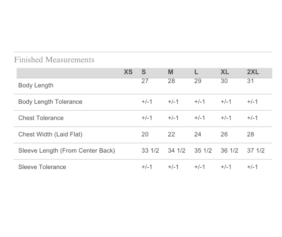 | Size | Width (IN) | Length (IN) | Sleeve Center Back (IN) |
