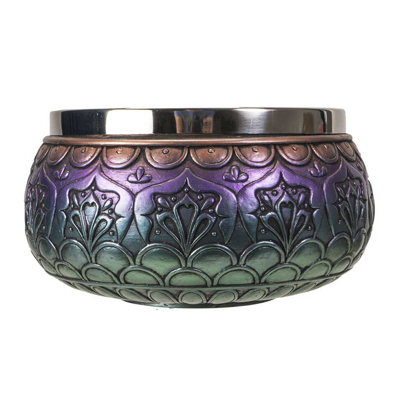 Offering bowls are sacred vessels used in various spiritual and religious practices to present gifts, prayers, or symbolic offerings. Mandala Resin Ritual Offering Bowl Product Size: 5.5" X 5.5"X 3" Material: Cold Cast Resin w/Stainless Steel Insert Case
