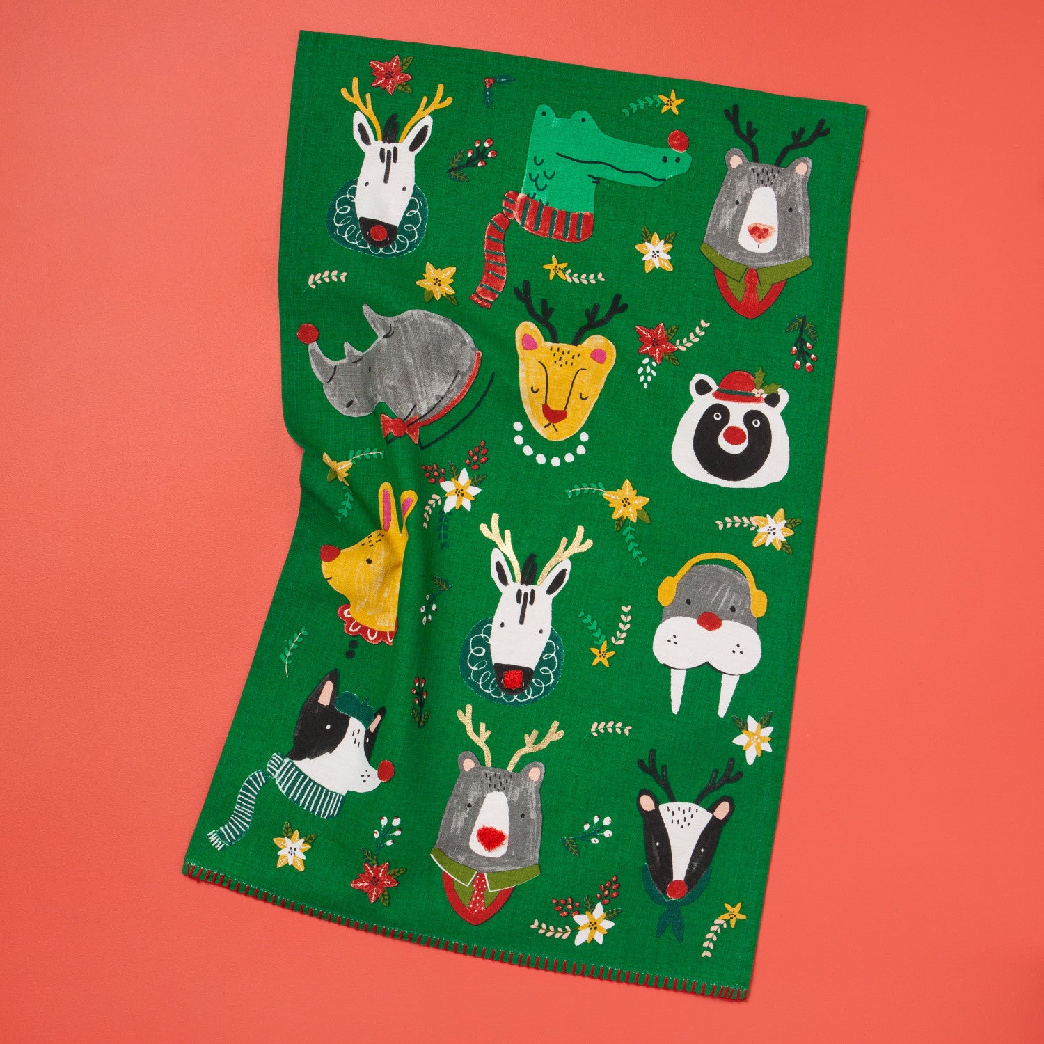 Eager to be hailed holiday heroes, these cute creatures are cueing up for the role of the renowned red-nosed reindeer. Featuring an embroidered hem and textural surprises, this cotton dishtowel brings something extra special to the holiday home.