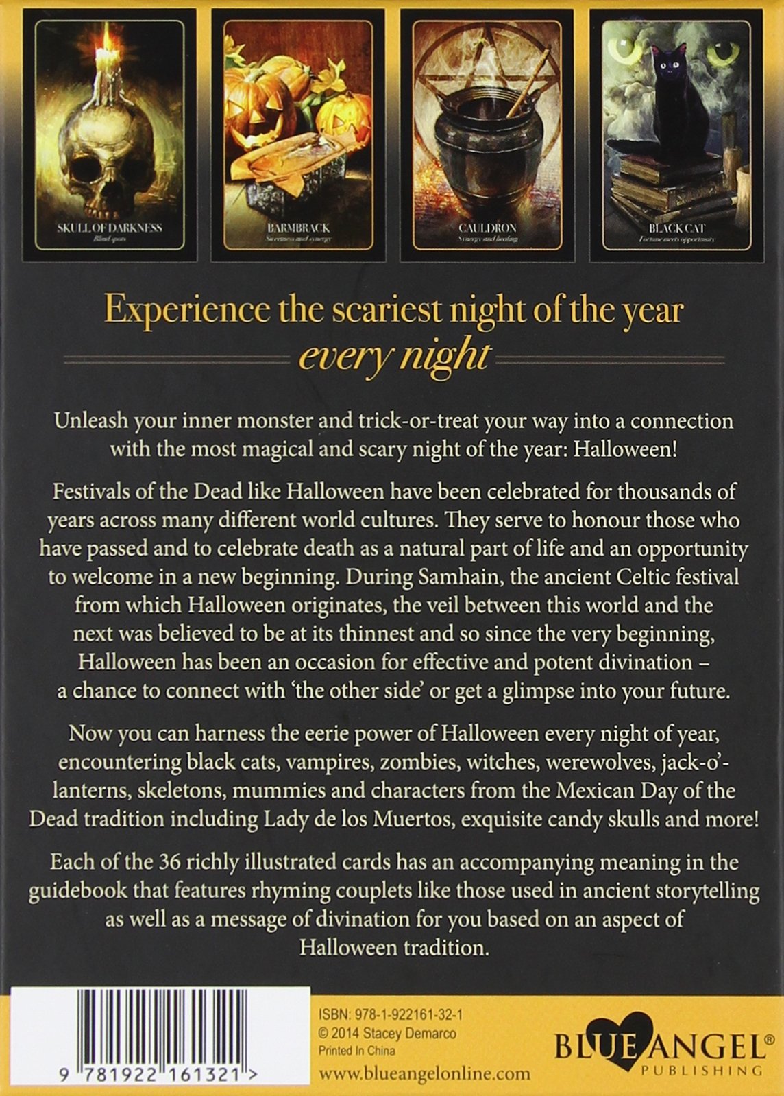 Now you can harness the eerie power of Halloween every night of year, encountering black cats, vampires, zombies, witches, werewolves, jack-o-lanterns, skeletons, mummies and characters from the Mexican Day of the Dead tradition (including Lady de los Muertos), exquisite candy skulls, and more! Each of the 36 richly illustrated cards has an accompanying meaning in the guidebook featuring rhyming couplets like those used in ancient storytelling as well as a message of divination for you based on an aspect of Halloween tradition.